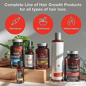 [Targets hair loss by blocking DHT activity*, Targets male and female pattern hair loss and supports hormonal balance*, Encourages new hair follicle growth by boosting blood circulation*, Heightens the flow of oxygen and nutrients to hair follicles*, Helps collagen fibers in the hair follicles interlock*, Heightens the production of keratin and collagen*, Targets sebum-related hair loss*, Provides hair growth-enhancing nutrients*, Scavenges free radicals linked to hair loss*]